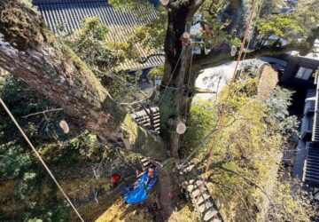 ロープワーク技術を活用して特殊伐採を行うので、クレーン車や高所作業車などの重機が入らないところでも対応可能です。