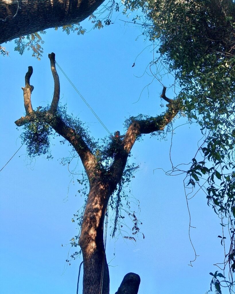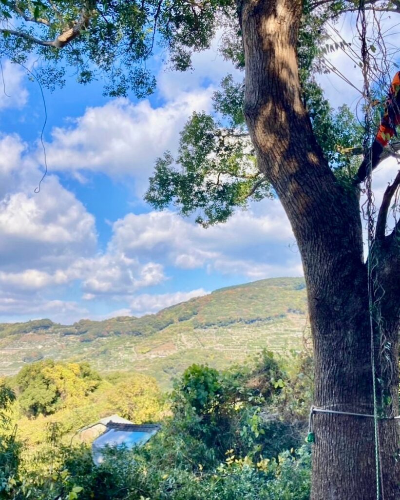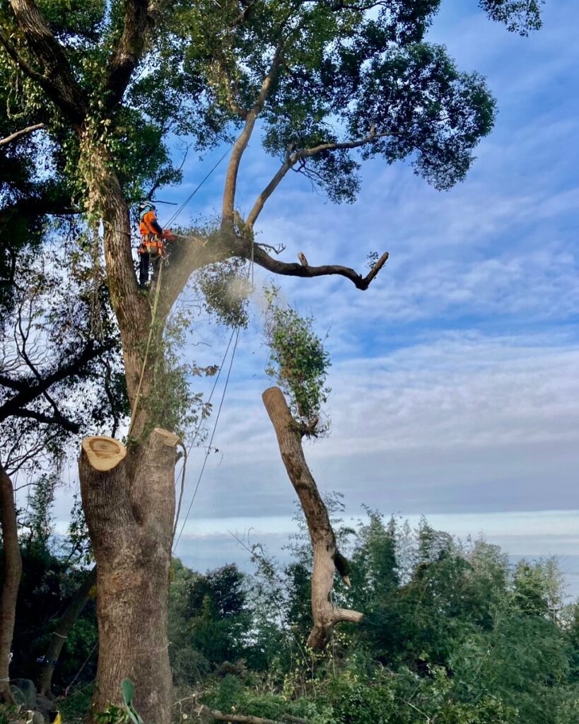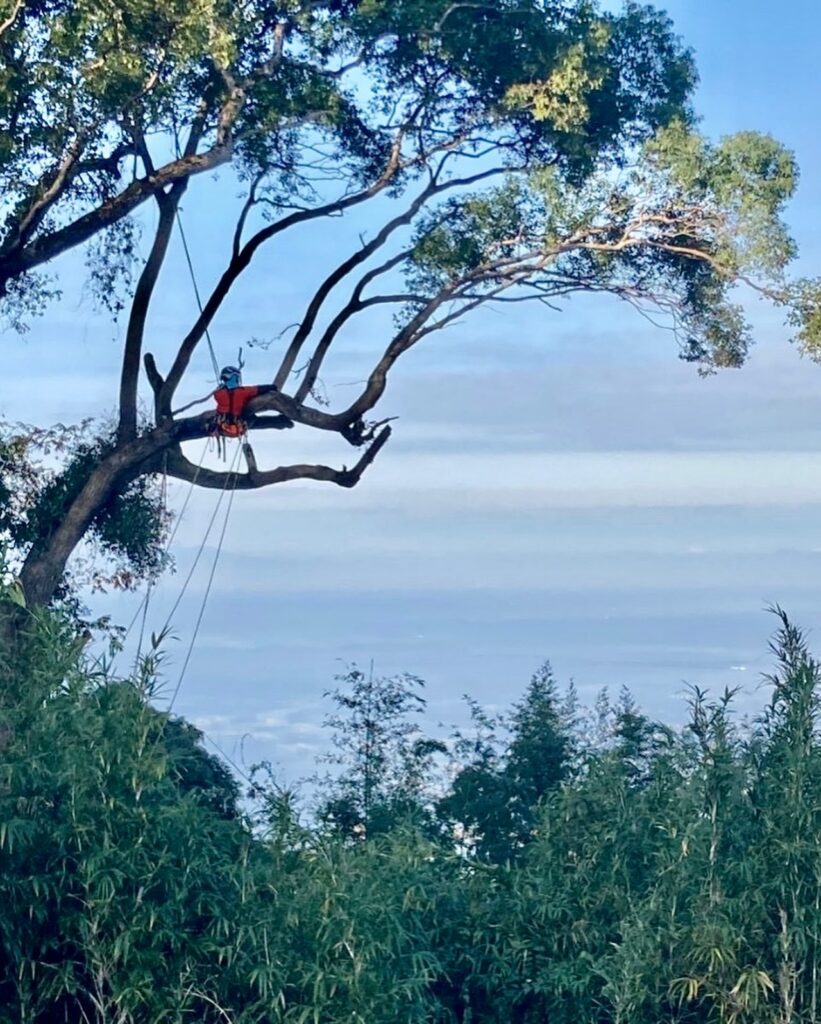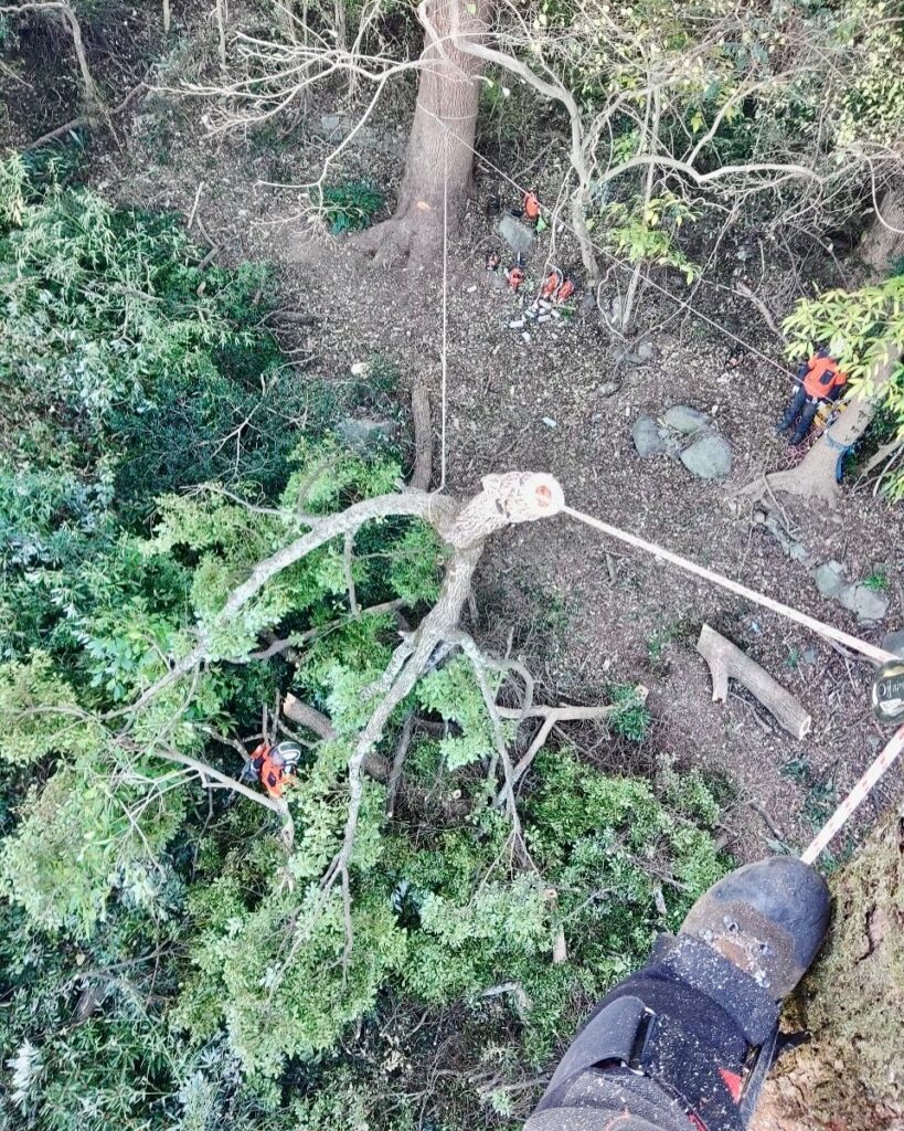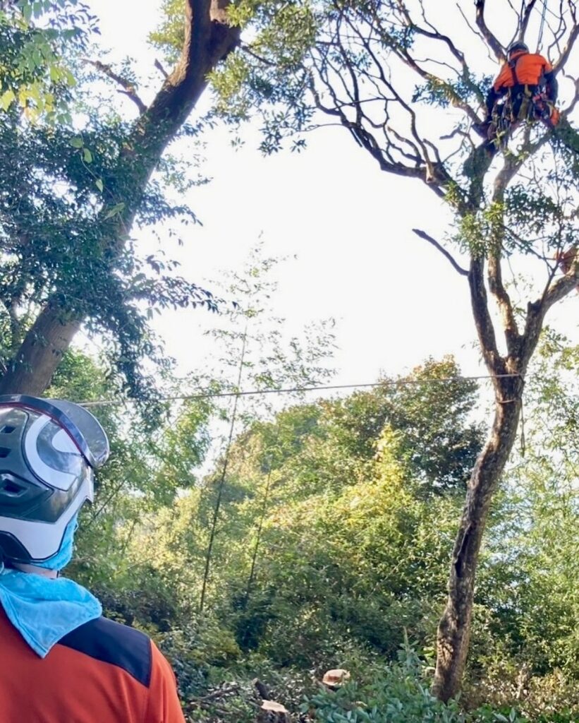 有明海を望むこちらの現場は、周囲がミカン畑になっておりそのまま伐倒することが難しかったため、登り込み枝を落としてからの伐採作業となりました。