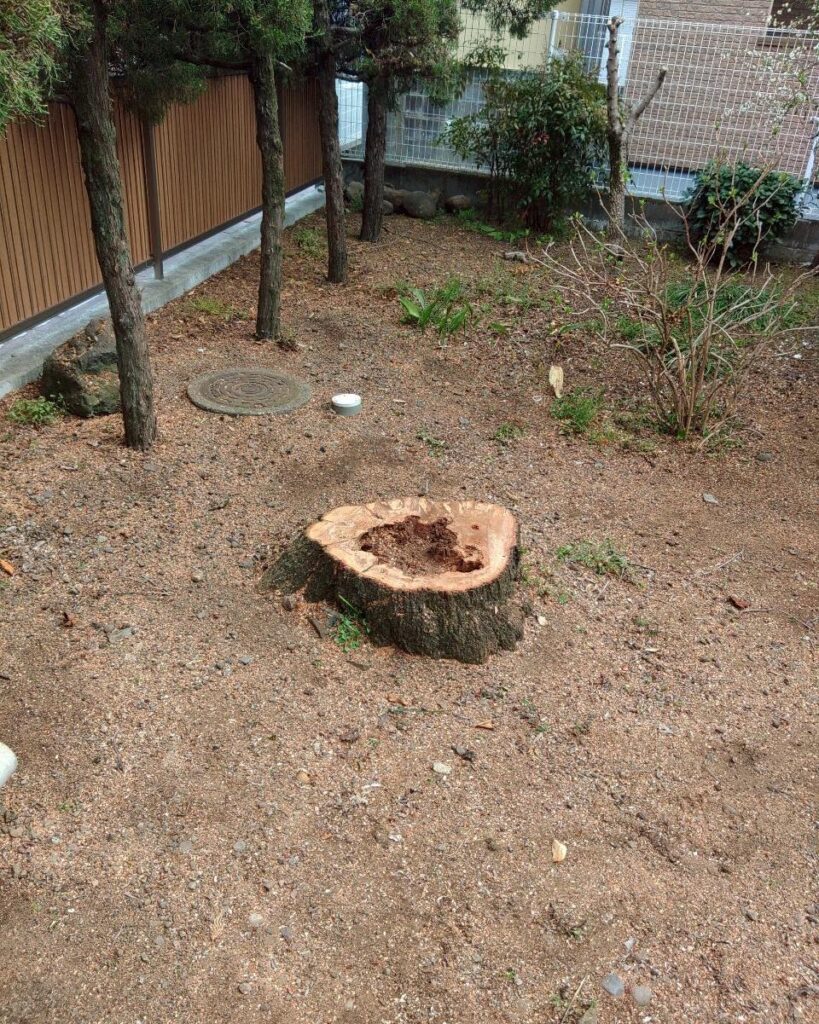 伐採した切り株を見てみると、空洞になっておりました。来た時よりも美しくを心がけておりまして、もともと落ちていた葉っぱなども含め、仕上げ清掃も丁寧に行いました![]()