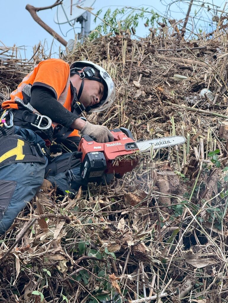 しかし高所作業車などの機械が入らない立地条件のため、今回も山猿お得意のロープワークによる施工を実施しました。