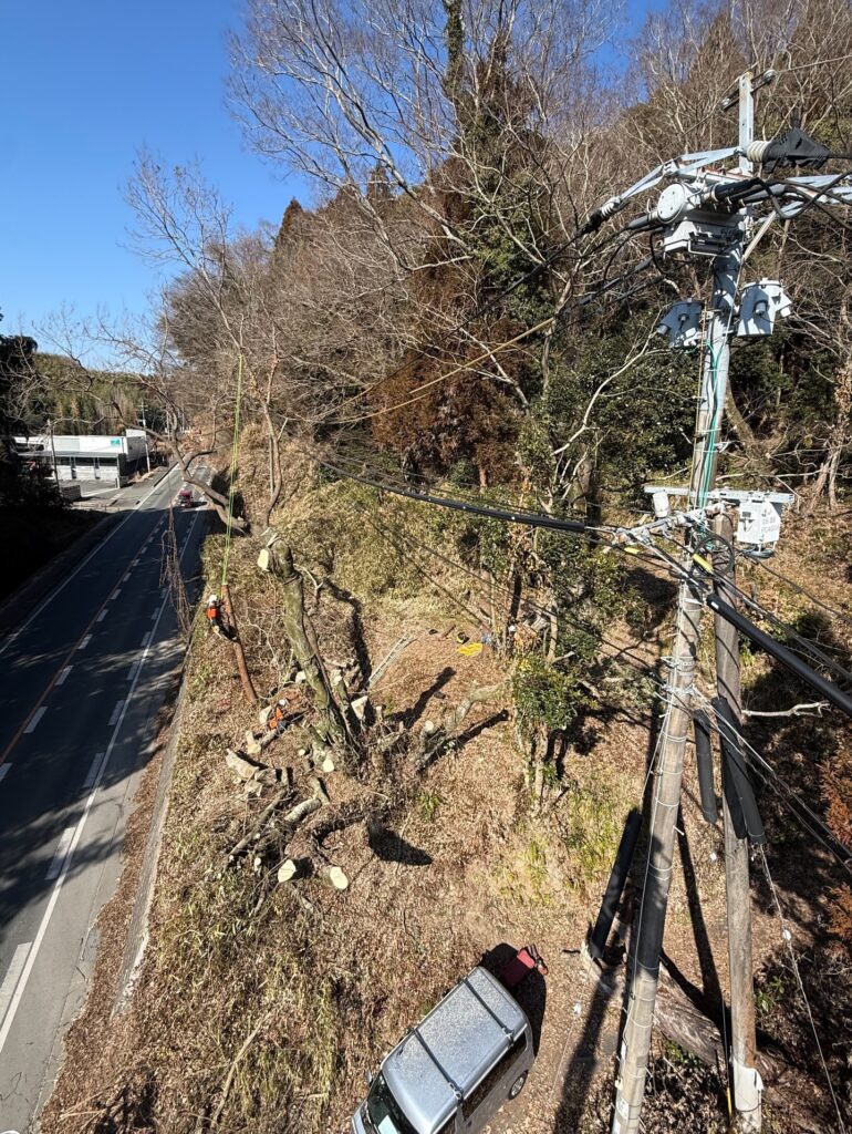 作業現場のすぐ近くに木にもたれかかっている倒木寸前の木を発見!
