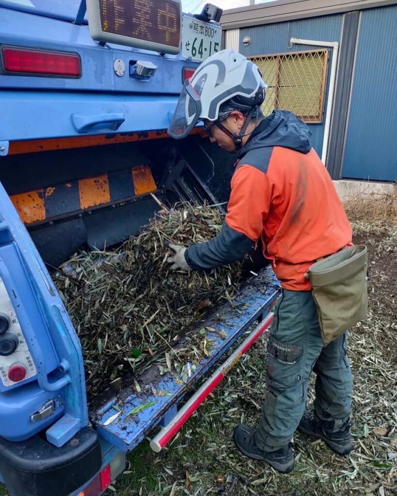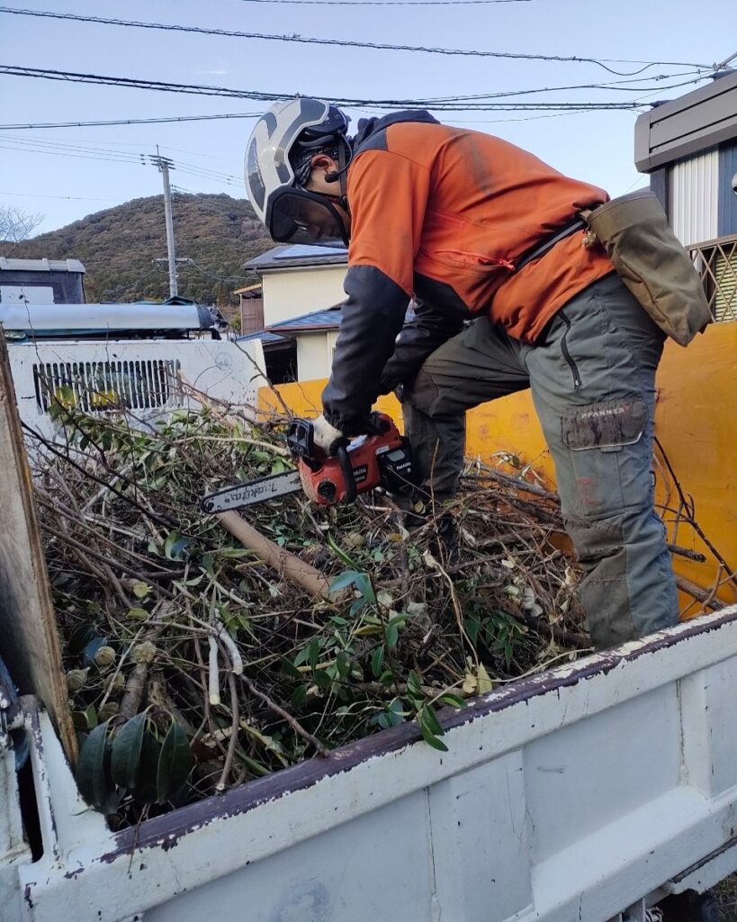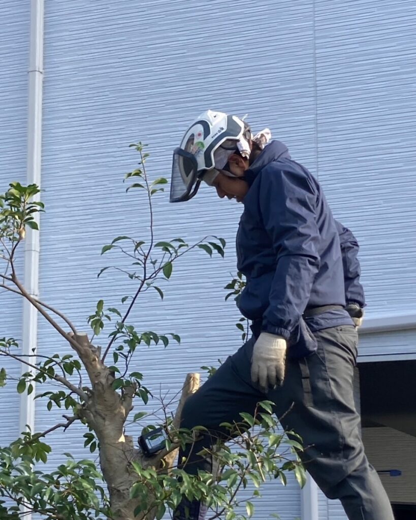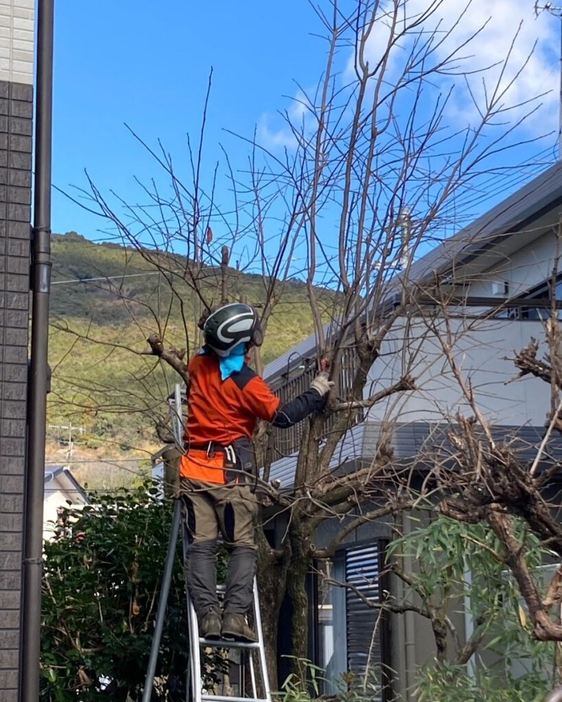 熊本市北区龍田にて 7年前に当社で枝おろし剪定をご依頼いただいたお客様よりリピートしていただき、今回もクスノキなどのチェンソーを使った剪定を行いました