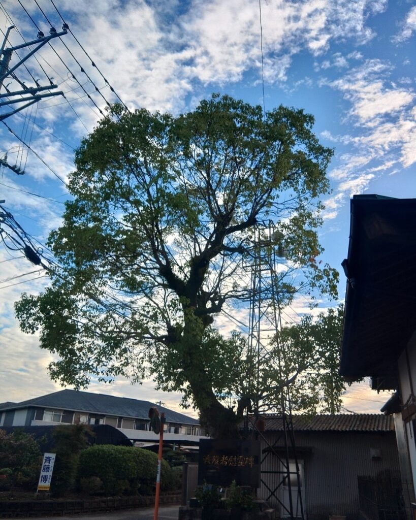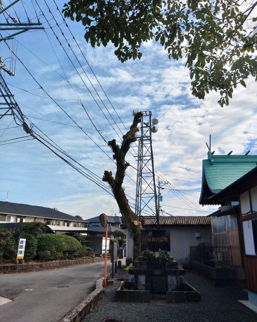 楼門に向かって偏心しており、楼門のすぐ近くにある木に上部が引っかかっているだけの状態でした。